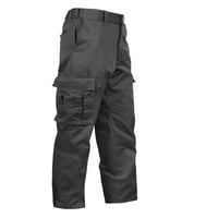 Poly/cotton twill pants with adjustable waist tabs, reinforced seat and knees, 2 cargo pockets, 2 button down pockets, 2 front slash pockets, button fly and drawstring bottoms.